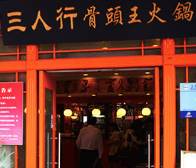 三人行獨特的骨頭王火鍋——敲骨吸髓汲之精華,剔骨取肉食之肌腱。手抓牙撕,痛快淋漓的獨特風味,正是三人行受到廣大上海地區消費者歡迎的原因之一。創新改良的川菜,讓人體驗到不同的巴蜀風味,形成全新的養生觀念川菜,使之不但保留了川味的風格,更引入了健康理念。